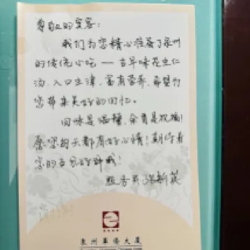 入住的時候,前台小姐姐超熱情,不僅給我介紹了泉州非遺花燈,還讓我選喜歡的茶葉。進房間裏發現居然還貼心準備了水果和泉州特產!!晚上還有本地特色甜湯!甜湯超好喝!!細節簡直拉滿了!早餐更是驚喜,麪線糊、牛肉羹這些閩南特色全都有,吃早餐時候還碰到一位老奶奶説這就是老泉州的老味道。而且不管碰到哪個工作人員,都特別熱情,能感受到那種發自內心的真誠。 這次入住,真的被酒店的暖心服務感打動了。
