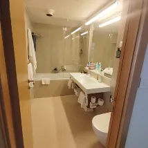 Ci ho dormito 2 notti, avendo prenotato con il cane ho trovato in camera un materassino e la ciotola x l’acqua. Molto bene, la sorpresa al mattino dopo la seconda notte alla cassa! Ogni cane paga 30€ a notte! Una pazzia, in tutta Europa 10€ per extra pulizia, lo capisco; in Svizzera ti mettono anche dei croccantini. Con 60€ compri più di un sacco da 12 kg. Per la camera abbastanza ampia, niente nel frigobar, in un 4 stelle almeno una bottiglietta di acqua potrebbero metterla. Cuscini veramente disastrosi tutti uguali gnoccolosi. Ristorante con molta varietà ma bisogna arrivare presto, più tardi scarseggia o finisce l’ampia scelta. Molto buona e abbondantissima la colazione. Scarso il parcheggio per le auto. Scarso