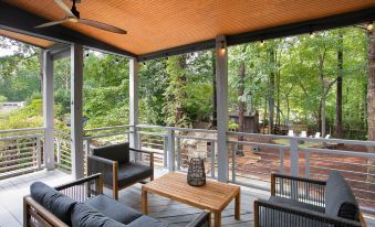 Enjoy peaceful mornings or evenings on the covered back porch overlooking a large, private, wooded backyard—complete with a gas grill and a hand-built stone fire pit, perfect for relaxing gatherings and making s’mores.