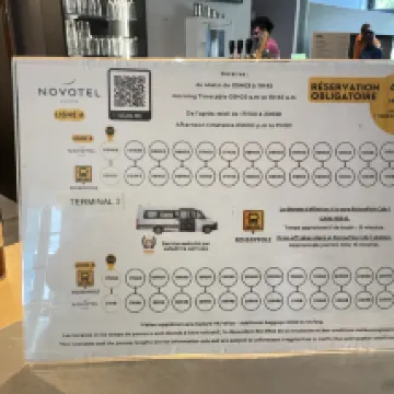 我問是不是要去巴黎戴高樂機場諾富特套房酒店(Novotel Suites Paris Roissy Charles de Gaulle),結果被告知“不,那是一家民宿(B&B)”,然後就上不了車。不過,後來我才意識到飯店的名字日文和英文不一樣。 30分鐘後我到了,出示了英文的飯店名稱,才知道自己去的是對的地方,最後終於上了車。