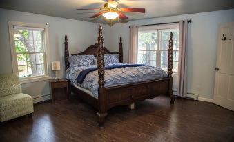 Rest easy in one of the 4 beautiful bedrooms, each with its charm. Each bed has linens, pillows, and comforters, and the rooms all have curtains so you can sleep in them.