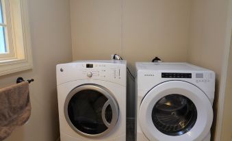 Right in the half bathroom, guests appreciate the nice new washer and dryer. Detergent is provided for two laundry loads.