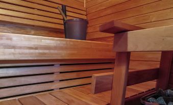 Row house apartment in 1991, living room/kitchen, bedroom with 2 beds, bedded in a double bed, a loft (23 m², steep stairs, no child safety gate), 2 beds and 2 mattresses, a sauna (electric stove), washroom, WC, terrace. Downstairs 38 m², loft 23 m². Sauna and floor in living room renovated in 2016. Outdoor storage for skis (no lock) and ski maintenance room in shared use.