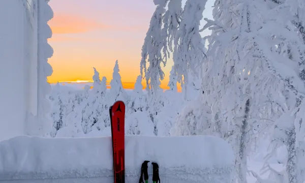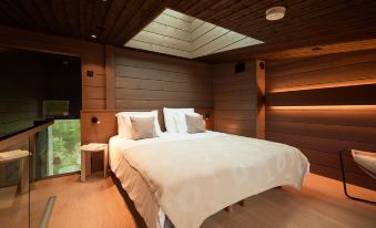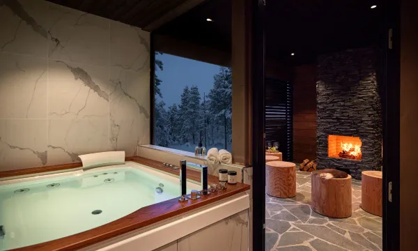 Each VALO Ice Cube Villa has a spacious ground-floor bedroom with a double bed and en suite bathroom featuring a rain shower, toilet and complimentary toiletries. The large and luxurious spa area is also located on the ground floor and comes is equipped with a jacuzzi, double rain shower and Finnish sauna. This room also has a separate toilet. The spacious, open-plan living area on the second floor is perfect for cozy moments by the wood-burning fireplace, inviting you to experience the calm of Nordic nature from the large south-facing window facing Finland’s largest national park. These villas also come with a full, luxury kitchen featuring high-end appliances, including a dishwasher, oven, kettle, coffee maker and other comforts. You will also find a large wood dining table with space for 10 people. There are two large studios on the second floor, each with a spacious bedroom with double bed and a heated glass skylight that allows you to admire the northern sky from the comfort of bed. Each studio also comes with a bathroom with a luxurious rain shower. There is ample closet space and plenty of room to create extra sleeping space. Adventure awaits – book your stay today.
