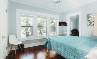 The hallway leads to 2 luxurious master suites, each with a king bed. The stunning master bathroom is a true retreat—choose between soaking in the clawfoot tub or refreshing in the double shower with soaker jets. Watch TV in bed or step out to the large front porch or garden deck to enjoy the Florida weather.