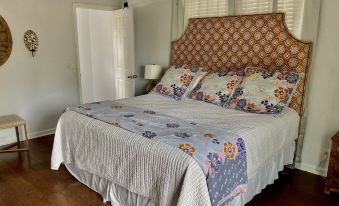 Master Bedroom – the master bedroom contains a king-size bed with a custom upholstered headboard. The room has a dresser big enough for all your folding clothes and is topped with a 32” HDTV with streaming abilities. Off the master is a balcony with a table and two chairs which is absolutely wonderful for sitting early in the morning and having coffee. There is a nice view all the way down the street from the balcony. The bathroom is newly renovated with a single sink, toilet, and porcelain tub with a tiled shower and glass barn door. There is a large walk-in closet with more than enough room for all your clothes. There is a ceiling fan in the room, which pushes a good amount of air if you need airflow to sleep well.