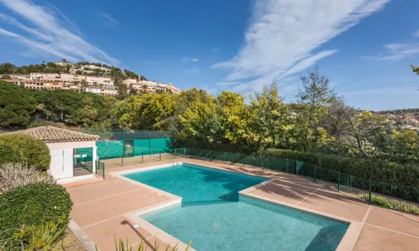 Terraced house "Le Bougainvillier". 35 houses in the residence. In the district of Golf de Sainte-Maxime, on the outskirts, 4 km from the centre, in a quiet position on top of a hill, in the residential district, 3 km from the sea, 3 km from the beach, in a cul-de-sac, on the golf course, south facing position. For shared use: swimming pool fenced (depth 110 - 175 cm, seasonal availability: 01.Jun. - 30.Sep.). Tennis, boccia, public parking 350 m on the road. Grocery 2 km, supermarket 4 km, restaurant 3 km, bus stop 3 km, railway station "TGV Saint-Raphael" 23 km, sandy beach "La Nartelle" 3 km, thermal baths "Thalasso les Issambres" 7 km. Sports harbour 4 km, golf course (18 hole) 100 m, tennis 50 m. Nearby attractions: Golf de Sainte Maxime 100 m, Saint-Tropez Ramatuelle 18 km, Port-Grimaud 15 km, Gorges du Verdon 75 km, Navette / shuttle boat St-Tropez 15min 4 km. Hiking paths: Massif des Maures 5 km, Massif de l'Esterel 23 km. Please note: car recommended. Residence with electric gates. Airfield 80 km from the property. Property ref. FR8480.212.1 is situated on the same property. "Le Bougainvillier", 3-room terraced house 48 m2 on 2 levels, south facing position. Object suitable for 2 adults + 2 children. Renovated in 2024, modern and tasteful furnishings: living/dining room 22 m2 with veranda with TV (flat screen), air conditioning. Exit to the loggia. Open kitchen (oven, dishwasher, 4 ceramic glass hob hotplates, toaster, kettle, microwave, freezer, electric coffee machine). Upper floor: 1 room 10 m2 with 1 french bed (1 x 160 cm, length 200 cm). 1 room 7 m2 with 1 pull-out bed (2 pers. 2 x 80 cm, length 200 cm), air conditioning. Shower, sep. WC. Heating, air-conditioning. Balcony furniture, electric barbecue, covered balcony. Distant view of the sea and golf course. Facilities: washing machine. Internet (WiFi, free). Garage (1 car). Please note: non-smoking house. Smoke alarm. Offer by a commercial proprietor according to Art. 155, IV, CGI 83115005475MX