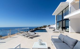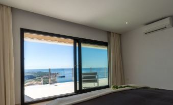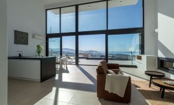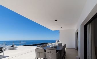 At Villa Royal, you can reach the front door with your car and enter the villa without any steps. Upon entering the villa, you'll notice how spacious and bright it is. The hallway leads to a large open living room with a glass facade spanning the entire width and a high ceiling, offering you a breathtaking panoramic view. There is a modern seating area with a TV and a fireplace for winter evenings. The integrated, modern kitchen features a kitchen island and all the necessary appliances to prepare a delicious dinner. The island has several bar stools where you can sit to keep the chef company while enjoying the sea view. There are both indoor and outdoor dining tables. The villa has WIFI and satellite TV with a wide range of European and international channels.