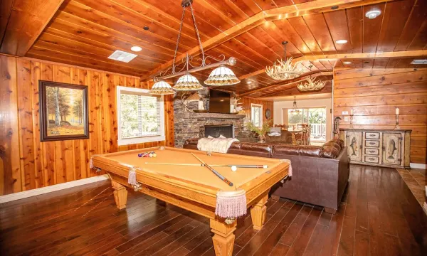 Get off the grid in style. Experience nature and total privacy on 20 secluded acres of private property, surrounded by the San Bernardino National Forest. Only 75 miles from LA and OC, but feels like you're worlds away. Just you and the deer! Walking trails in the summer become a winter wonderland when snow falls. Catch the perfect après ski vibe in front of a massive stone fireplace over a game of pool. Soak in a bubbling hot tub on the 1,200 sq ft outdoor deck with cozy seating around the fire. This is living!