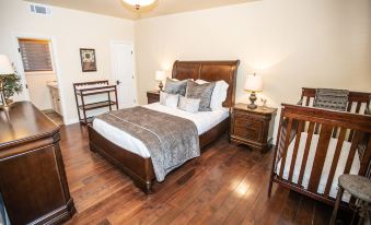 Rustic cabin decor with upscale touches. Comfortable beds with linen and flannel sheets. A large, well stocked kitchen with brand new utensils and appliances, wine fridge, and two large dining tables that comfortably allow up to 16 place settings. Coffee maker and Nespresso machine. Massive wood burning stone fireplace in the living room and an additional wood burning stove across from an extra comfy sofa in the study. Aromatherapy bar with essential oil diffuser. Board games, puzzles, tether ball, horseshoes, bocce ball, outdoor fun. Huge fenced yard. Level entry, with two bedrooms and two full baths on ground floor.About pets:Pets allowed: dogs (limit 2 total).Well trained pets are welcome..About checkOut:Check out before 10:00 AM.About children:Children allowed: ages 0-17.Lots of fun for the family!.About customRules:Absolutely no fires outside of fireplaces.No guns or shooting of any kind,No motorized vehicles beyond the driveway.About checkIn:Check in after 2:00 PM.About smoking:Smoking is not permitted.Absolutely no smoking indoors or out..About minBookingAge:Minimum age to rent: 25.About events:No events allowed.Events and commercial activities are prohibited..