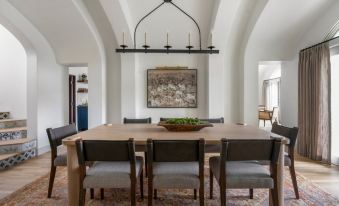 Elegant Entry: Step inside through the grand entrance where craftsman woodwork sets the tone for the refined living spaces. Further in you'll be welcomed by a wrought-iron staircase and a redesigned dining room with elegant arches.