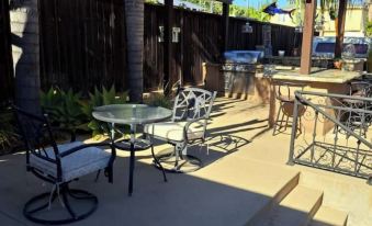 這裡有一台全新的疊式洗衣機和烘乾機,方便您洗衣。(所以請儘量輕裝出行。)您可以在自己的露台上享受日光浴或品嚐晨間咖啡。室外廚房和島台旁還配有額外的桌椅,方便您使用燒烤爐。(請注意,室外廚房位於公共區域,與主屋共用。)