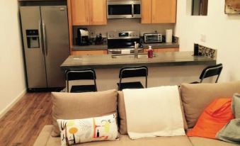 房屋全新裝修。精心設計的庭院通往螺旋樓梯,方便您進入這片私密空間。屋內配備全新不銹鋼電器、山核桃木地板、新鋪地毯的臥室以及一張全新的雙人床。衣櫥內備有熨斗和熨衣板。標準尺寸的衣櫥空間充足,足以懸掛您所有的衣物。客廳新添置了一張可轉換為雙人床的沙發。一張小桌子和兩把椅子可用作書桌。廚房鍋碗瓢盆和各種烹飪用具一應俱全。廚房檯面上配備了 Keurig 咖啡機(提供少量咖啡)和烤麵包機。您可以在島上的早餐吧享用美食。