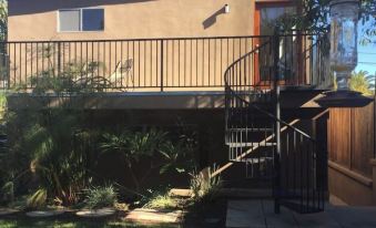 The home is newly remodeled. A fully landscaped yard takes you to a Spiral staircase to access your private getaway. The home has new stainless steel appliances, Hickory hardwood flooring, newly carpeted Bedroom with new queen bed. There is an iron and ironing board in closet. A standard size closet gives plenty of room to hang all of your clothes. The living room has been newly furnished with a sofa that converts to a full bed. A small Table with two chairs can be used as a desk. The Kitchen is fully stocked with pots and pans and utensils to cook with. There is a Keurig coffee maker (some coffee is provided.) and a toaster oven on the counter top. Enjoy eating at the Island breakfast bar .