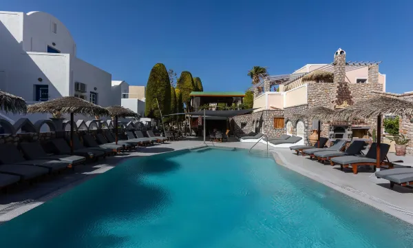 Bij onze aankomst in de ochtend om 10.30 uur was onze accommodatie al gereed, personeel staat direct paraat voor je en spreken allen (Housekeeping, Ontbijt en uiteraard receptie) keurig Engels, wat je verblijf nog verder veraangenaamt. Men doet daar echt hun best voor je! Locatie is top van dit Hotel, dichtbij centrum, strand en de geweldige boulevard, met echt vele gezellige eettentjes, restaurants en loungebars. Dit hotel is in principe een aantal accommodaties, die allen zeer mooi zijn opgebouwd en verwerkt in het geheel, ziet er echt mooi uit. De accommodaties zijn keurig uitgerust, incl. keuken. Dit hotel heeft 2 zwemgelegenheden, een klein pool-badje inclusief lounge bedden en een wat groter zwembad, ook hier staan een aantal lounge bedden en kun je prima zwemmen, baantjes trekken of met de kinderen in het water spelen! Verder heeft het grotere zwembad, ook een Poolbar, met een zeer aardige gastvrouw (Vanessa), die samen met haar hulpje, de hele dag door lekkere drankjes en lunches e.d. maakt (tegen betaling uiteraard), maar is zeker de moeite!! Tot 15.30 uur kun je eetgerechten bestellen. Ontbijt(buffet) was top, veel keus en dagelijks gevarieerd, ook hier spreekt men keurig Engels naar de gasten. We hebben vanuit hier ook paar keer een taxi gehuurd, wat echt een aanrader is (lekker in de airco en plaatsjes snel aan te doen). De verbinding via de bus is ook prima (bushalte slechts een paar straten verder) je dient wel steeds naar de hoofdstad Fira te rijden en vanuit daar steeds over te stappen naar je gewenste bestelling. Iedere dag een strakblauwe lucht en kun je echt overal mooie foto's van maken, de witte gebouwen in het mooie donkerblauwe contrast van de lucht, maken de vele foto's tot echte schilderijen! Echte aanraders qua restaurants (die wij op aanraden van locals) hebben aangedaan zijn; Summertime, Taverna Saliveros en Amelia (de eerste 2 liggen op de boulevard aan het strand, wat het eten echt tot een geweldige belening maakt). Qua prijs zitten deze zéker lager dan in Nederland. Verder enorm veel leuke en mooie souvenierswinkeltjes. Hou er wel rekening mee dat het kan gebeuren dat je even zonder warm water, of stroom kan zitten, dit vanwege de (grote) vraag (door toeristen in de ochtend), maar was ook snel weer voorbij. We vinden dit hotel i.c.m. bovenstaande een zeer grote aanrader en willen hier zeker nog eens terugkomen, was echt top!