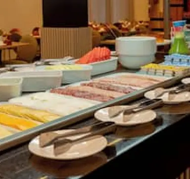 O café da manhã é bom, mas alguns itens são de muito baixa qualidade. Os queijos indicados como Prato e muçarela não eram queijos e sim processados. É o primeiro hotel que eu vejo servir processado como se fosse queijo. Nem em hoteis muito baratos se vê isso.