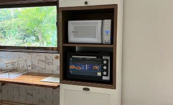 A complete kitchen, with dishes, cutlery, glasses, cups, pots, and various small appliances (microwave, air fryer, coffee maker, mixer, citrus juicer, and even a popcorn maker to ensure a movie night). The refrigerator also produces ice and unlimited filtered water.