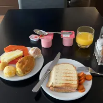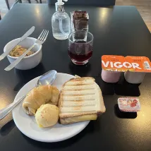 O café da manhã é muito bom,com frutas variadas, bolos, pães, sucos etc,porém o local onde é servido é um pouco apertado.
