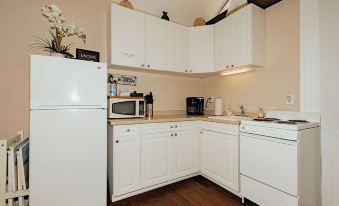 We have an extremely comfy king bed in the bedroom. The kitchen has a Duo Keurig coffee maker and everything you need to cook with if you choose.