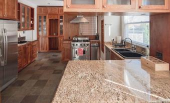 The fully equipped kitchen has everything you need to whip up delicious meals, including a gas stove, microwave, refrigerator, and ample counter space. Enjoy your morning coffee at the cozy breakfast nook with seating for two.