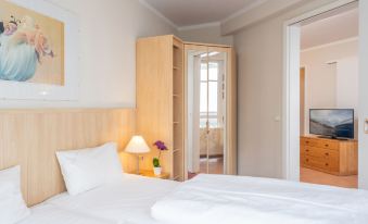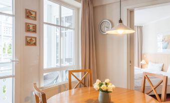 Resort "Seepark Sellin", 4 storeys. 8 houses in the residence. 200 apartments in the residence. 800 m from the centre of Sellin, on the outskirts, 8 km from the centre of Göhren, 10 km from the centre of Binz, 800 m from the sea. For shared use: property, well-kept garden with lawn. Table tennis, children's playground. Private: children's playground. In the complex: reception, restaurant, table tennis, table football, boutique, storage room for bicycles, central heating system, washing machine (extra), tumble dryer (for shared use, extra), bicycle rental. Bread roll service. Communal covered parking (extra). Supermarket 100 m, bus stop "Sellin, Hauptstrasse" 700 m, railway station "Sellin Ost" 400 m, sandy beach 800 m, indoor swimming pool 100 m. The photo is just an example. All houses/apartments are individually designed/furnished. 3 free SKY channels included. AHOI swimming pool approx. 100m away, discount available at reception. 2-room apartment 52 m2, on the upper floor. Practical and cosy furnishings: living/sleeping room with 1 double sofabed, dining table and cable TV (flat screen). Exit to the balcony. 1 room with 1 double bed. Exit to the balcony. Kitchenette (4 hot plates, toaster, kettle, electric coffee machine). Sep. WC, bath/WC or shower/WC. Gas heating. Carpet. Balcony. Balcony furniture. Facilities: children's high chair, baby cot. Internet (WiFi, free). Parking (extra, 1 car). Please note: non-smokers only. Maximum 1 pet/ dog allowed. Smoke alarm, fire extinguisher.
