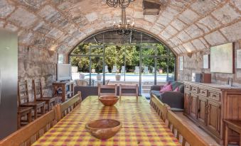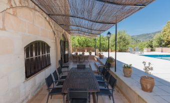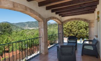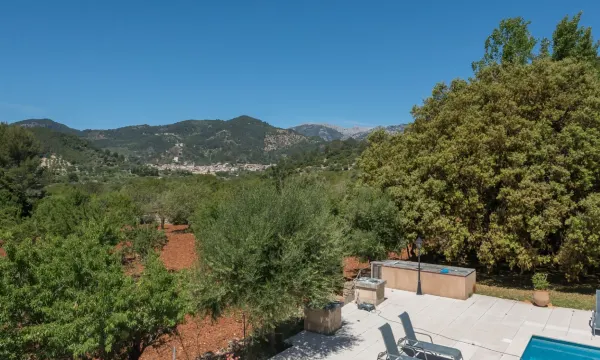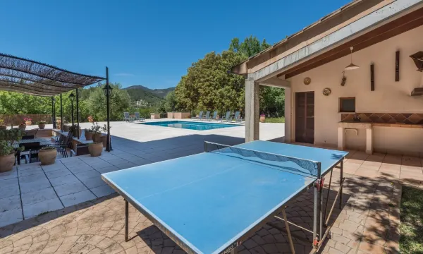 Selva: Very large, beautiful, comfortable villa "Les Mines", 3 storeys, surrounded by fields. Outside the resort, 2.4 km from the centre of Selva, in a quiet, sunny position, 1 km from the edge of the forest, 28 km from the sea, 28 km from the beach. Private: large, beautiful garden with lawn and wildlife garden, swimming pool angular (8 x 4 m, seasonal availability: 01.Jan. - 31.Dec.). Shower/WC in the pool area, outdoor shower, table tennis, patio, arbour, pergola, garden furniture, barbecue. In the house: internet access, WiFi, storage room for bicycles, central heating system, air conditioning, washing machine. Roofed, parking at the house. Shop 2 km, grocery 2 km, supermarket 2.5 km, restaurant 2 km, bar 2.2 km, bakery 2 km, café 2 km, bicycle rental 2 km, pub garden 2.5 km, 30 minute walk to the centre, bus stop 2 km, sandy beach "Port d'Alcúdia" 28 km. Sports harbour 30 km, marina 30 km, golf course (18 hole) 25 km, tennis 2 km, riding stable 4 km, sports centre 2 km, walking paths from the house 1 km, cycle lane 1 km. Nearby attractions: Mirador Crist Rei 1.5 km, Monasterio de Lluc 15 km, Iglesia de Selva 2 km, Restaurante Miceli 2 km, Bar Can Pereo 2 km. Please note: car recommended, no lift. Suitable for families, suitable for seniors. Object suitable for 14 adults groups of teenagers on request only. Loading and unloading of baggage is possible at the holiday house. Airfield 45 km from the property. "Les Mines", 10-room villa 360 m2 on 3 levels. Object suitable for 14 adults. Spacious, fully renovated, very comfortable and cosy furnishings: large living/dining room with panoramic window with dining table, TV, flat screen, air conditioning and forced-air heating. Exit to the patio, to the swimming pool. 1 large double bedroom with panoramic window with 1 french bed (150 cm), gas heating, air conditioning and forced-air heating. 1 large double bedroom with panoramic window with 2 beds (90 cm), gas heating, air conditioning and forced-air heating. Open kitchen (oven, dishwasher, 3 ceramic glass hob hotplates, microwave, freezer, electric coffee machine) with gas heating, air conditioning and forced-air heating. Exit to the patio, to the swimming pool. Bath/shower/WC. Gas heating. Upper floor: (exterior staircase) large dining room with dining table, gas heating, air conditioning and forced-air heating. Exit to the loggia. 2 large double bedrooms with panoramic window, each room with 1 french bed (150 cm), bath/shower/WC, gas heating, air conditioning and forced-air heating. 2nd upper floor: (exterior staircase) large living room with panoramic window with open-hearth fireplace, gas heating, air conditioning and forced-air heating. Exit to the balcony. 1 large double bedroom with panoramic window with 3 beds (90 cm), gas heating, air conditioning and forced-air heating. Exit to the balcony. 1 large double bedroom with panoramic window with 1 french bed (150 cm), bath/shower/WC, gas heating, air conditioning and forced-air heating. 1 room with 1 bed (90 cm), bath/WC, gas heating, air conditioning and forced-air heating. Bath/shower/WC, hydro massage shower. Comfortable furnishings in the country house style. Large balcony, large patio, lawn. Terrace furniture, balcony furniture, barbecue, deck chairs, covered balcony. Very beautiful view of the mountains and the countryside. Facilities: washing machine, iron, children's high chair, hair dryer. Parking (roofed) at the house. Suitable for families. ETV424 ESFCTU000007022000058112000000000000000000000ETV4244