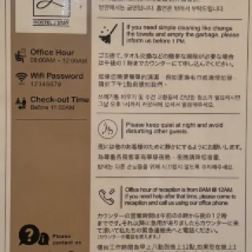 很棒的旅舍!所有衛浴用品、毛巾、吹風機、空調、冰箱、椅子、鏡子、電視……一應俱全。浴室非常寬敞。大廳提供茶、水等等(老實說我沒時間使用),還有備用毛巾、牙刷和牙膏,隨時可以取用。地理位置超讚。而且我入住很早,大約11:30就入住了,他們幫我安排了第一個空房。我還單獨預訂了一天(當時情況特殊),當然他們沒有分開預訂,只是把我安排在一個房間裡,我在那裡度過了美好的5個晚上。我強烈推薦這家旅館(我在韓國住過20-30多個地方,我知道很多😄)