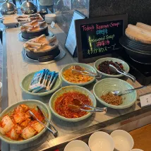 離明洞和首爾站很近,購物很方便。 餐廳是自助餐,所以我在休息室用餐。他們有韓式菜餚,像是熱石拌飯,還有漢堡,每樣都很美味。剛好是我的生日,所以我點了一杯西瓜冰沙♪謝謝你的用餐!