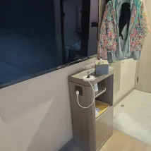 房間空間比較小,放個行李箱就無法走路了。然後門口外堆放裝修物品,有影響逃生安全疑慮。其他方面都還可以。