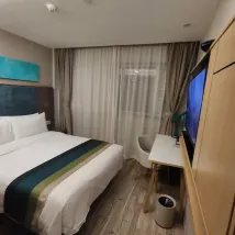 酒店位置方便,周邊出行、購物都比較便捷。房間大小適中,基本設施齊全,但部分設備有些老舊,使用起來不太順手。衞生狀況整體還行,不過角落有一些灰塵沒清理到位。服務態度尚可,但響應速度有待提高。總體來説,體驗一般,希望能有所