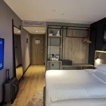 房間乾淨整潔,前台服務人員熱情,貼心,地理位置較好,還有機器人送餐,性價比比較高,大廳還能聽聽音樂辦公,很滿意,前台也還幫忙給多續了半小時房間。
