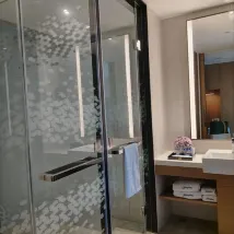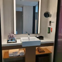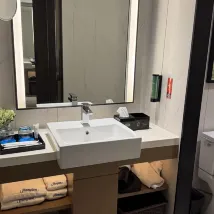 服務態度是好的,設計不合理 不太像希爾頓底下品牌 1.空調太吵 調到最低2檔也不行 叫了師傅上來看説正常現象 也有小姐姐一起上來 讓看隔壁房間可不可以 看了一樣 聲音有感覺就像空調外機就掛室內感覺 沒有看到有客户反饋這個 我們自己不太能接受這個噪音 2. 沒有行李箱的位置 3.洗手間乾的區域挺大但是浪費了洗手枱空間 洗手枱小了 4. 免費可以享用的東西挺多 但是沒有free 牌子提醒 都分不清説free還是收費 酒店後面的江河風景不錯 整體可以 就設計上感覺掛四星很勉強