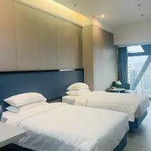 搭乘捷運至國貿站(綠線1號)。酒店位於該地區最高建築的頂層。樓下有醫院和購物中心。房間視野開闊,包含早餐套餐(豆漿、饅頭、水煮蛋)和下午茶小點。辦理入住後,搭乘電梯至28樓,再轉乘至30樓。恆溫泳池位於A座4樓。 需額外支付50元。