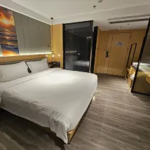 這酒店的高評分,我不知從何而來,反正我入住覺得麻麻地,第一.酒店所處位置,樓下就是沐足店,跟酒店同一個電梯,人員太複雜!第二.洗澡房沒有乾濕分離就算了,還連放衣服的架子都沒有,第三.床頭竟然還搞兩個玻璃裝飾的吊燈,帶孩子入住太危險了!第四.廁所抽風機開着,感覺開拖拉機,不開,又感覺房間太悶,第一次讓我覺得住酒店沒有住家裡舒服!