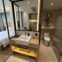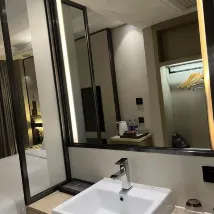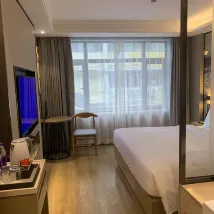 首先免費升級了房型哈,酒店的通風系統很好中央空調,洗手間下水道沒有反臭的異味,距離2號線湖貝站超級近50米左右好方便,3個站就可以到蓮塘口岸,旁邊就是向西村,旁邊吃的很多,附件有一家KTV,足浴等,前台服務很好,大廳有免費的咖啡,爆米花,酸梅汁,衞生乾淨環境還可以哦,值得推薦