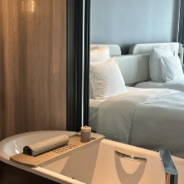 非常好 5星級值得擁有 房間的浴缸可以看到電視📺一流! 位置就在高鐵站旁邊,非常方便 可惜的是枕頭還是一般酒店的質素,睡不慣 還有房間晚上感覺有點點煙味 冷氣控制不太容易 除此之外,整體感覺都非常好 Check-in的時候,小孩在等待的時候大堂就有位叔叔弄糖果給他們,讓小孩都忙起來