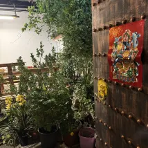 很有格調,房間內還放置書籍,種有綠植,榻榻米床,很舒適;被罩衞生還有待於改進。適逢倒春寒,房間頂棚過高,配有空調,但不太熱。