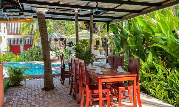 We absolutely loved this place. The rooms are very clean. We had the family room and this was very spacious and nice. Perfect place to go to Angkor wat en afterwards relax at the pool. The pool is small, but always enough space to swim and play as not so many people are often in the pool. Breakfast is really good. Lunch and dinner is also possible as there is a menu with some choices (Asian and western). Most dishes are USD 5. Also, with tuk tuk, many restaurants are close by. All staff is very friendly. Some speak very good English (especially the front desk). Some limited English but that’s totally fine. Hotel reception can arrange airport taxi as well as many tours and visit to Ankor wat. Very convenient, as you pay to reception and not to the drivers themselves.