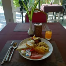 住宿方回覆: Dear value guests,Thank you very much for taking the time to share your experience with us.We’re pleased to hear that you enjoyed the peaceful atmosphere of our resort and were able to relax by the poolside from your room—many of our guests love that easy pool access and the calm, quiet environment. We're also glad you appreciated the generous portion sizes at our restaurant and the overall value of your stay.We do understand your comments regarding the location. While we’re slightly outside the downtown area to offer a more tranquil setting, we agree that using a Tuk Tuk is often the most convenient and affordable way to explore Pub Street and the city center. Thank you as well for pointing out the issue with the TV in your room—we sincerely apologize for the inconvenience. We’ve shared your feedback with our maintenance team to ensure this is resolved for future guests.Your comments are extremely valuable to us as we strive to provide both comfort and quality to all our guests. We hope to welcome you back again, perhaps with an upgraded experience and even better convenience.Warm regards,lok