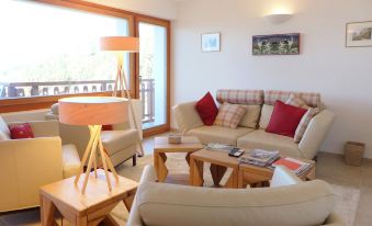 Comfortable 3-family house "Les Aiguilles Vertes", 4 storeys, built in 1962, renovated in 2015. In the district of Vermala, 1.7 km from the centre of Montana, in a quiet, elevated position, 1.5 km from the lake, 1.1 km from the skiing area, south-west facing position. For shared use: natural state property 1'273 m2. In the house: storage room for skis, central heating system, washing machine, tumble dryer (for shared use), ski boot dryer. Motor access (ramp). Single garage. Shop 1.7 km, supermarket 1.9 km, restaurant 1.5 km, bakery 2 km, bus stop "Vermala Centre" 200 m, railway station "Funiculaire Montana Gare" 2.1 km, bathing lake "Moubra" 2.7 km, lake Grenon 1.5 km. Golf course (18 hole) 2.8 km, skisport facilities 1.1 km. Well-known ski regions can easily be reached: Etang Long 2.9 km. Please note: ski bus (free of charge). "Les Aiguilles Vertes Rez inférieur", 3-room apartment 70 m2, on the upper ground floor. Comfortable and cosy furnishings: living/dining room with cable TV. Exit to the balcony. 1 room with 2 beds (90 cm, length 200 cm), bath/WC. 1 room with 2 beds (90 cm, length 200 cm). Kitchen-/living room (oven, dishwasher, 4 induction hot plates, toaster, kettle, microwave, electric coffee machine, Capsules for coffee machine (Nespresso) extra, raclette grill, fondue Set (chinoise, cheese)). Shower/WC. Large balcony 20 m2, south-west facing position. Balcony furniture, deck chairs (2). Very beautiful view of the mountains and the countryside. Facilities: iron, hair dryer. Internet (WiFi, free). Garage space n 2, height 190 cm, width 230 cm. Please note: non-smokers only. Maximum 1 pet/ dog allowed. No lift.