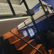 1. 公用厠所很臭, 門大多都壞了 2.公用浴室有時沒熱水, 且沒地方放衣物, 只有3個掛勾可掛, 非常不方便 3. 入住發現枕頭上有髒污, 且有霉點 4. 浴巾整理房間時, 沒有更換 5. 房間木地板擦的很乾淨 6. 床欄太淺, 睡覺翻身很危險; 雙人床很小, 二人睡很擠; 冷氣出風口在床頭, 直吹頭/腳, 沒地方閃; 天花板不夠高, 常撞到頭 7. 爬上床的樓梯非常窄, 會撞到膝蓋, 上下要非常小心