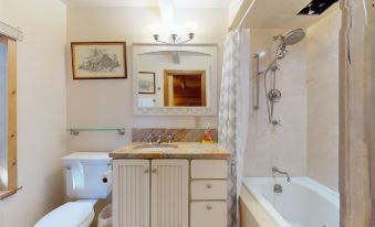 Rustic charm and chic modern touches meet in this cozy mountain home, accompanied by hexagonal tile floors and tongue-and-groove pine on the ceiling and walls. Enter to the middle level to find the main living area with an enormous wood fireplace framed by natural stone and soft furnishings atop a large area rug. Play board games, soak in the private hot tub, or spend an evening watching movies on the living room's cable TV while the fireplace crackles in the background.