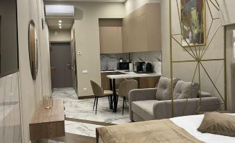 The hotel has a lobby bar for guests. The new, spacious rooms are decorated in a unique design that harmoniously combines premium aesthetics with ergonomics. Each room is equipped with a kitchen with a cooktop, household appliances and utensils necessary for cooking and serving food. The high level of service provides exceptional convenience, contributing to a comfortable stay at the hotel.