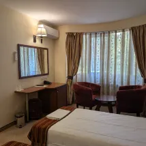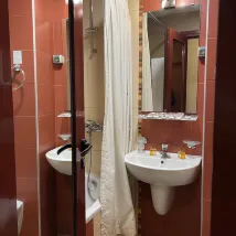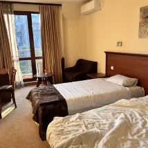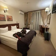 Мы брали номер на одну ночь, так как приехали поздно, а после уехали в горы. Отель расположен возле вокзала, стойка регистрации работает 24/7, так что не нужно доплачивать за поздний въезд, в целом, в номере было чисто. Не очень понравилось, что одеяла уже довольно старые и в желтых пятнах, мне было неприятно его использовать, хорошо, что было лето.