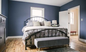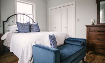 The farmhouse has three bedrooms upstairs all furnished with modern decor and cozy Anthropologie bedding. Two of the rooms have queen beds, and the third is a master with a king-sized bed and private bathroom with a jetted-tub AND shower. Plus, another full bathroom on the second floor!