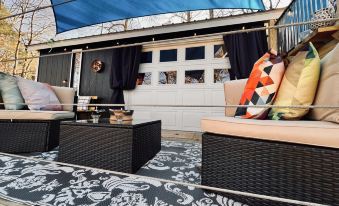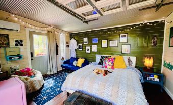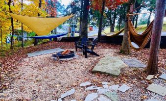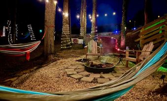 All 3 cabins are suitable for 2 adults and each unit has a queen bed. Units one and two have gorgeous soaking tubs and the third has a large walk in shower...we provide the robes! There are Keurigs and mini refrigerators and we provide plenty of KCups. We have installed quiet garage doors that open your bedroom/living spaces onto expansive decking, creating an open air vibe. Each unit has privacy walls for each deck space as well as private outdoor fire pits with outdoor furnishings (Adirondack chairs, hammocks, and swings are sprinkled all over the property). Just wait until you see this space at night!! Sparkling trees abound, italian lighting, murals on the buildings are lit, just so much fun!