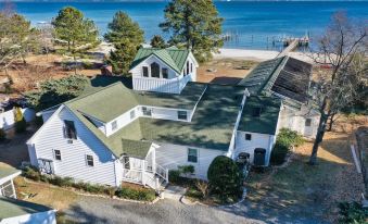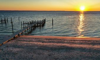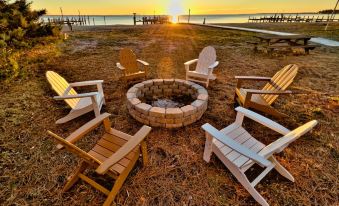 The property around the house is fantastic. There is a large front and back yard with a hot tub that fits 6-7 and an outdoor fit pit with relaxing Adirondack chairs. The river is mere steps from the house. There is a wide private beach for guests, kids will love finding shells and sea glass in between building sand castles and swimming in the water. The water is mostly clear with a sandy bottom. There is also a fisherman's walk at the end of the dock perfect for avid fishers. The luxury decking material, HDPE, keeps lower temps for bare feet in the hot weather. There is a foot washing station next to the hot tub/back entrance. Other fun amenities like kayaks, canoes, hammocks etc... will all be around for guests to enjoy and of course a grill too!