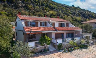 Supetarska Draga 7 km from Rab: 3-family house "Katica". In a sunny, elevated position, 100 m from the sea, 100 m from the beach. For shared use: property 1'000 m2 (fenced). Terrace (30 m2), garden furniture, barbecue. In the house: internet access, washing machine (extra) (for shared use). Parking at the house on the premises. Shop 700 m, restaurant 400 m, bus stop 4.4 km, sandy beach 5 km pebble beach 100 m (small). Marina 700 m. Please note: private mooring (extra) on request. 2-room apartment 50 m2 on 1st floor. Living/dining room with 1 double sofabed (180 cm, length 200 cm), satellite TV. Exit to the balcony. Entrance hall with air conditioning. 1 room with 1 french bed (180 cm, length 200 cm). Open kitchen (2 hot plates, oven, dishwasher, 2 gas rings, kettle, microwave, electric coffee machine). Shower/WC. Air-conditioning (extra). Balcony 15 m2. Balcony furniture. Beautiful view of the sea. Facilities: Internet (WiFi, free). Please note: non-smokers only. Maximum 1 pet/ dog allowed. Fire extinguisher.