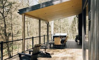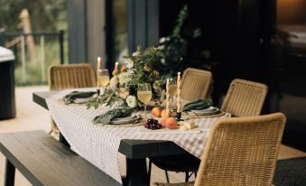 戶外餐桌非常適合露天用餐,室外樓梯可輕鬆前往小溪和火坑區域,為您的住宿增添一絲冒險氣息。