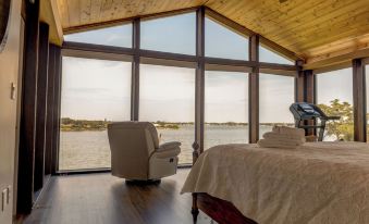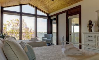 Master bedroom's comfortable king-size bed, surrounded by serene waterfront views.
